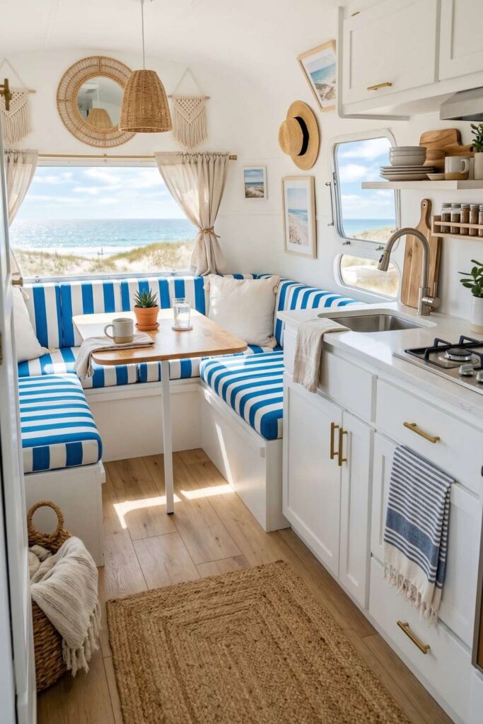Love the feeling of being near the ocean? A coastal-inspired camper like this brings that breezy beach vibe right inside. The blue and white striped seating instantly gives the space a relaxed seaside feel, while the light wood accents keep everything warm and inviting.