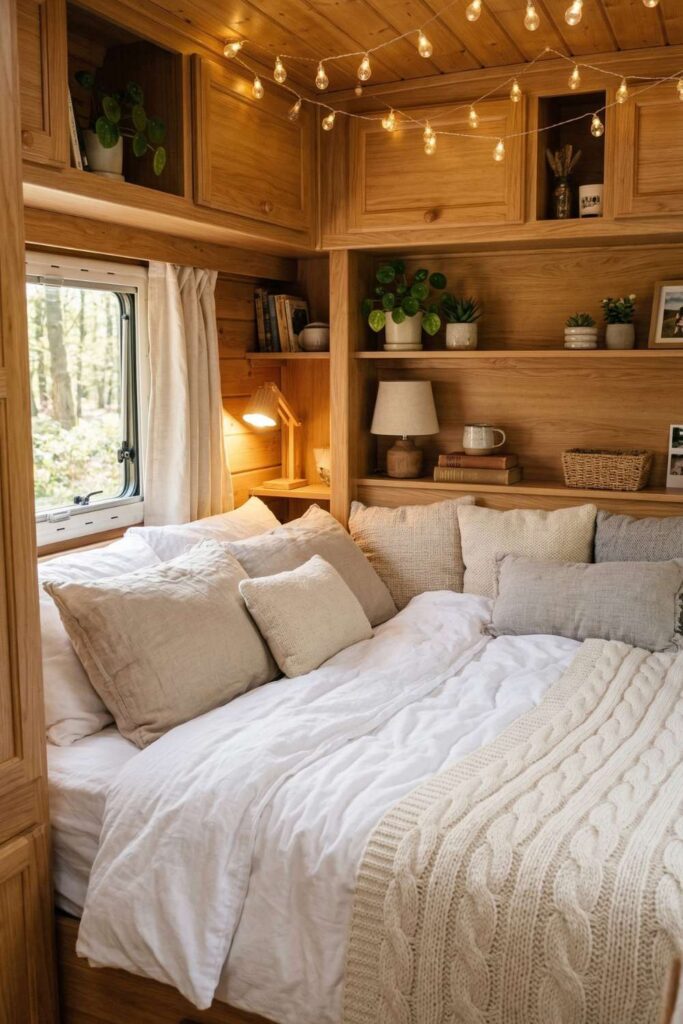 A sleeping space like this feels incredibly warm and inviting, especially with the soft glow of string lights above the bed. The natural wood walls create a cozy cabin-like atmosphere that makes the camper feel peaceful and relaxing.