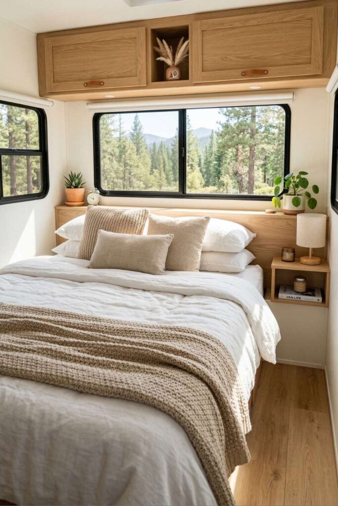I especially love how the large window above the bed brings in beautiful natural light and a peaceful view of the outdoors. Small bedside shelves and overhead cabinets also add useful storage without crowding the room. It’s a cozy setup that makes the camper feel much more like a real bedroom.