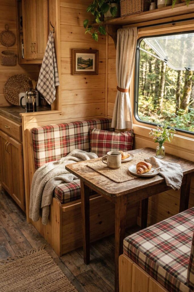 A cozy breakfast nook like this makes camper living feel extra special. The warm wood paneling and plaid cushions give the space that classic cabin-style charm.