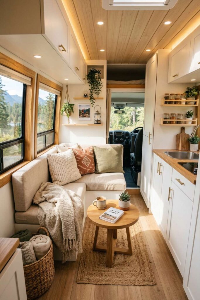 Soft cushions, light textiles, and natural decor help create a relaxing place to enjoy meals or unwind during travel. With its neutral color palette and thoughtful layout, this camper interior design feels both practical and stylish.