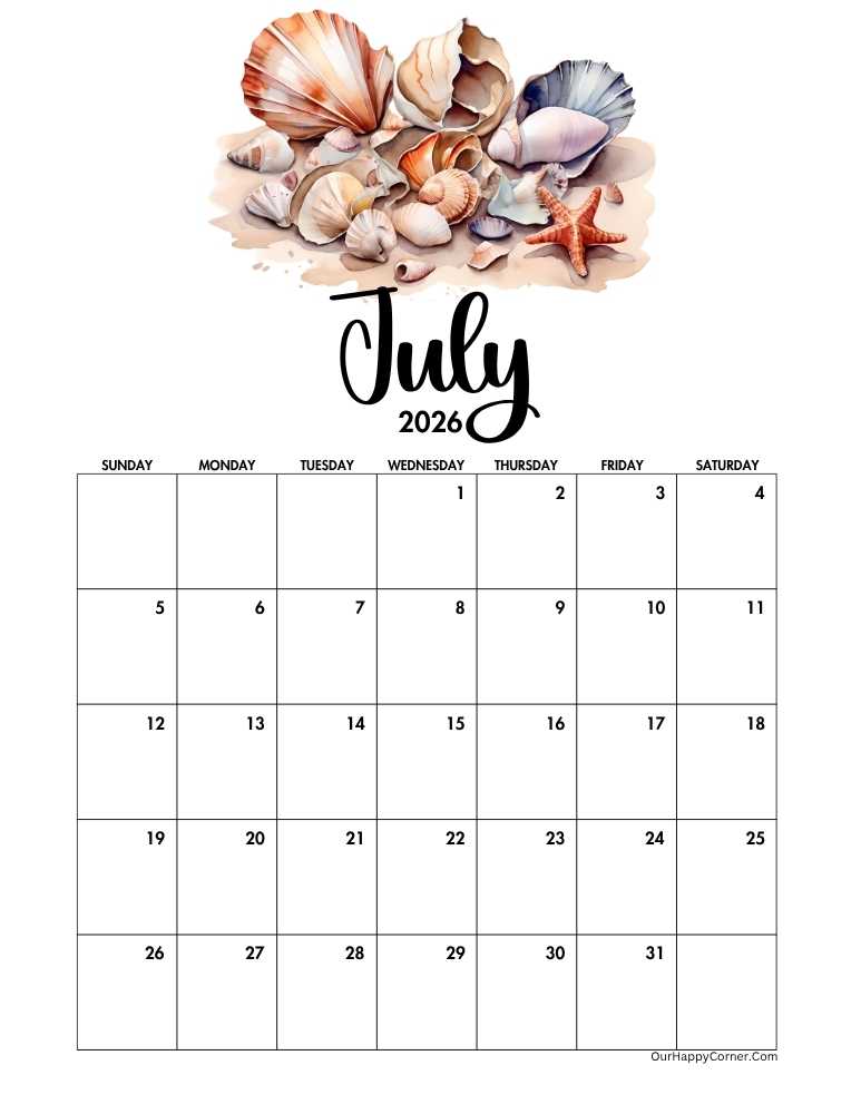 Bring the calm and charm of the coast to your planning with our beach & ocean vibes July 2026 calendar printables.